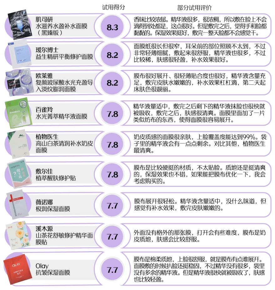 根据志愿者的真实评价,肌司研、瑷尔博士、欧莱雅等7款在主观试用中获得良好口碑。其中肌司研精华液很多,保湿效果较好;瑷尔博士肤感很轻盈,膜布剪裁有待改进;欧莱雅膜布贴合度高,敷后皮肤水嫩;百雀羚面膜容易展开,肤感清爽,保湿效果不错;植物医生膜布亲肤,肤感较清爽;敷尔佳保湿效果不错,膜布材质可以再优化一下;薇诺娜自然无味,志愿者反映有一定补水效果;溪木源采用奶皮质地膜布,肤感比较舒服;Olay则为棉柔质地,肤感轻盈舒适是一大亮点,但较多志愿者反映膜布展开略有难度。