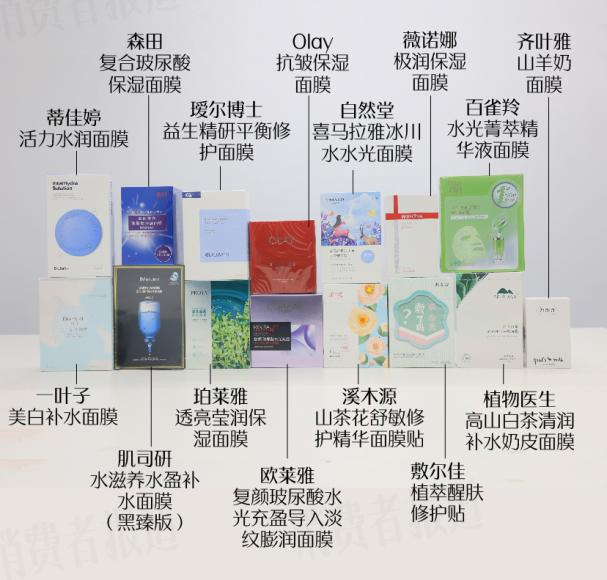 欧莱雅复颜玻尿酸水光充盈导入淡纹膨润面膜、珀莱雅透亮莹润保湿面膜、薇诺娜极润保湿面膜、肌司研水滋养水盈补水面膜(黑臻版)、蒂佳婷活力水润面膜、瑷尔博士益生精研平衡修护面膜、Olay抗皱保湿面膜、百雀羚水光菁萃精华液面膜、森田复合玻尿酸保湿面膜、一叶子美白补水面膜、齐叶雅山羊奶面膜、植物医生高山白茶清润补水奶皮面膜、自然堂喜马拉雅冰川水水光面膜、溪木源山茶花舒敏修护精华面膜贴、敷尔佳植萃醒肤修护贴