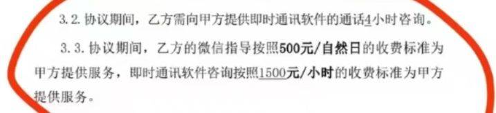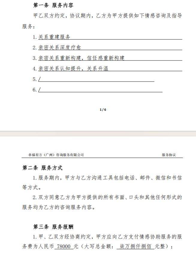 广州沐光咨询服务有限公司两位消费者出示的合同条款则显示,该公司向两位提供的其中一项服务均为即时通讯软件咨询服务,但收费标准却分别为800元/小时、1500元/小时。幸福有方两位消费者向《消费者报道》出示的合同显示,同样含有“亲密关系构建/重建”内容的合同,金额分别为7.8万元、近3万元。