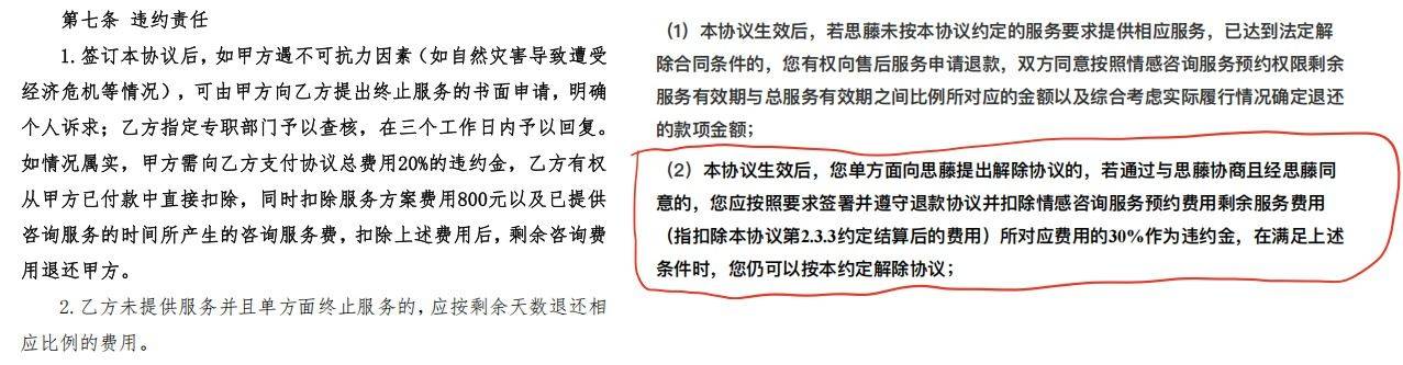 【幸福有方(左)、思藤咨询(右)有关违约责任的规定 图源:消费者供图】