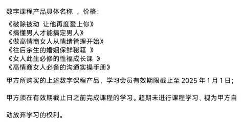 与其他消费者沟通并发现合同金额不一致后,消费者们开始质疑收集个人信息的流程实则是为“量身定制合同”做准备。山东的消费者夏薇对《消费者报道》记者称,她与有物文化签的第二份合同内容为《做高情商女人 从情绪管理开始》等6个数字课程,合同额为5.54万元,合同期(注:学习会员有效期)为一年,但后来被该公司的其他学员告知,其实半价也可购买。