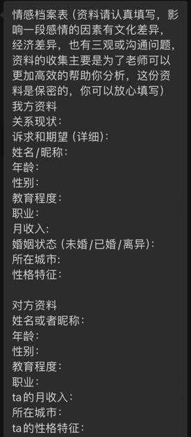 多位消费者对《消费者报道》记者称,与情感咨询机构签合同前,后者相关工作人员多以经济差异、文化差异等因素会影响一段感情为由,收集他们个人及其想挽回对象的个人信息,涉及年龄、职业、月收入甚至存款等情况。