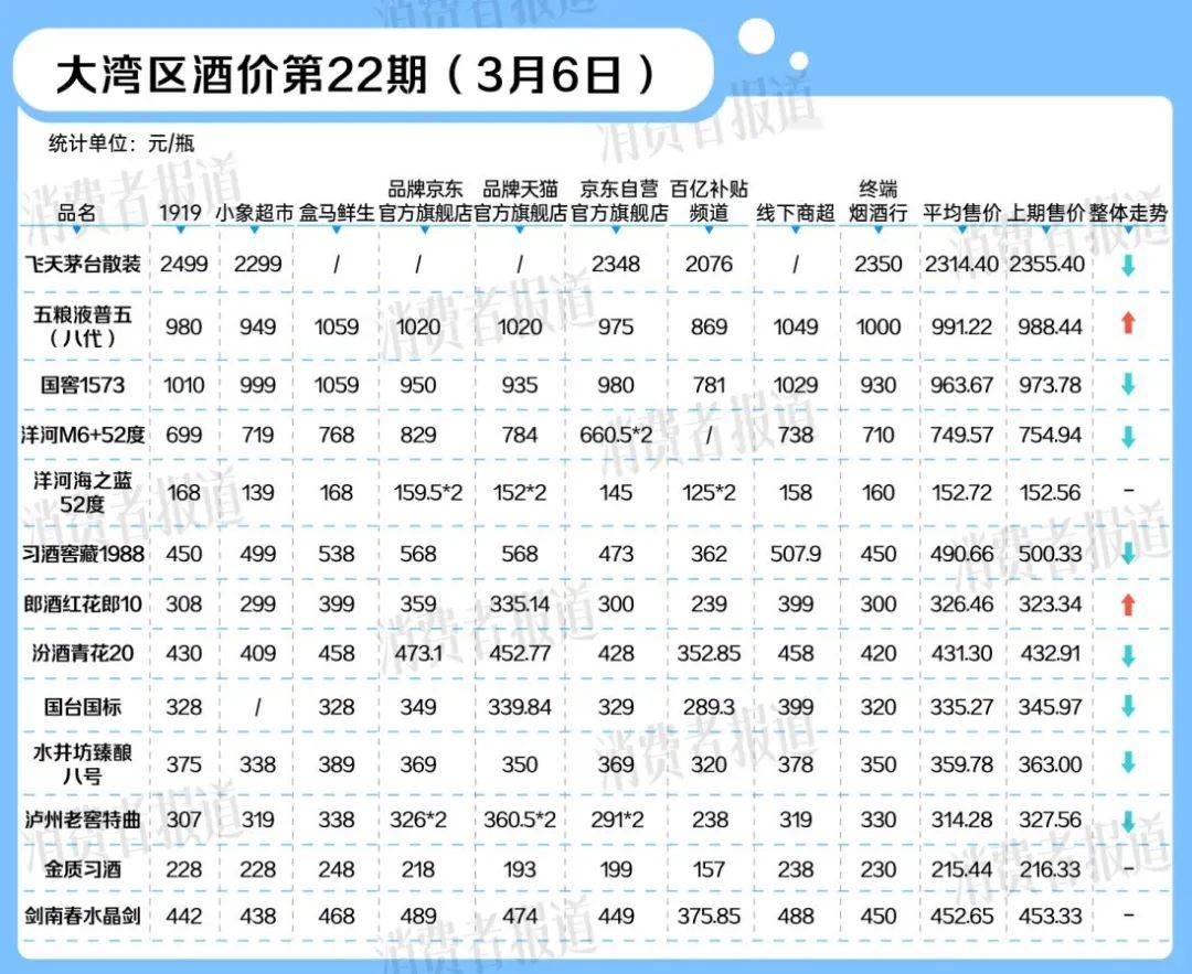 综合来看,本期《大湾区酒价》所统计的13款白酒产品中,共有8款白酒产品价格下跌,3款白酒产品价格基本不变,2款白酒产品价格上涨。