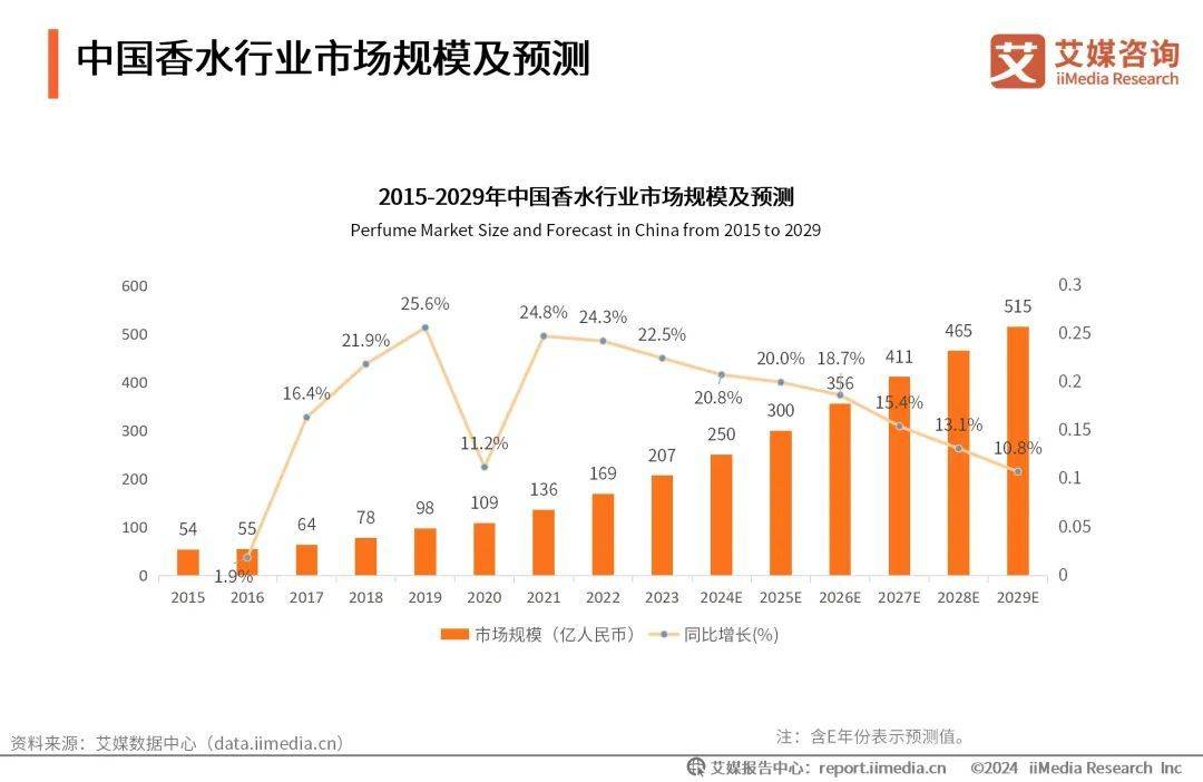 全球美妆行业正经历寒冬,香水市场却逆势崛起,成了“嗅觉经济”核心赛道。艾媒咨询数据显示,2023年中国香水市场规模达207亿元,同比增长22.5%,预计2029年有望达到515亿元。而且,中国香水市场的发展增速远还高于全球香水市场。