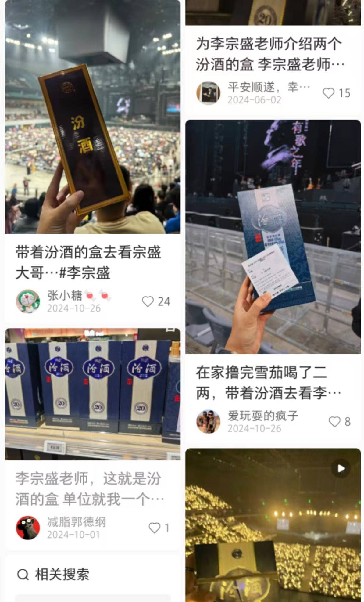 除了线上的饮酒互动以外,更有网友因为歌词“分久的合”与“汾酒的盒”的谐音梗,将一整盒汾酒特地带到线下明星演唱会打卡。