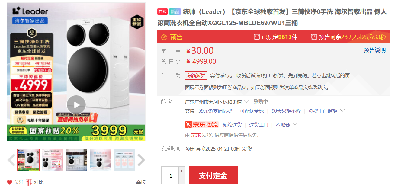 这款洗衣机的预售价为4999元,使用上20%的国补后,到手价预计为3999元。目前,海尔Leader三筒洗衣机在京东自营旗舰店的预定件数接近1万。