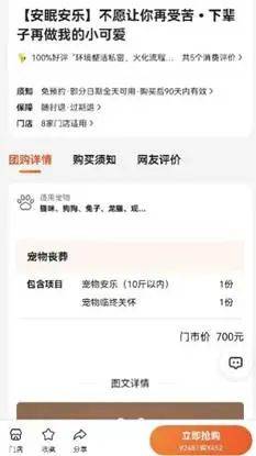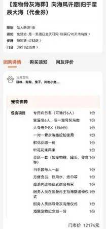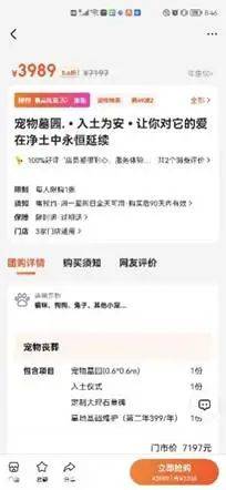除了祭祀相关的产品,市面上还有宠物安乐、墓地等服务。《消费者报道》记者在大众点评网站看到,广州番禺某宠物殡葬店就提供宠物安乐、骨灰海葬、宠物墓地等服务、产品。此中,墓地费用最贵,在大众点评上的团购价为3989元,包括一方0.36平方米的墓地、入土仪式、大理石墓碑、墓地基础维护费(一年)等。