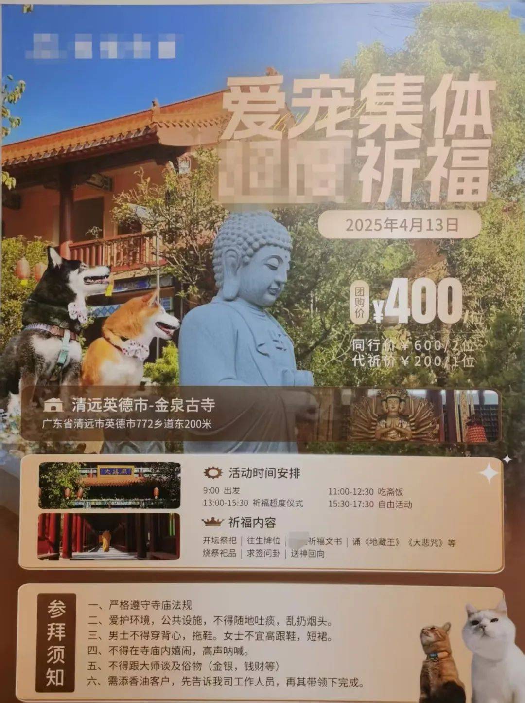 今年清明节,该店计划邀请宠物主集体前往清远金泉古寺,为爱宠祈福。活动内容包括开坛祭祀、诵经、求签问卦等,同行价为600元/2位,代祈价为200元/1位。