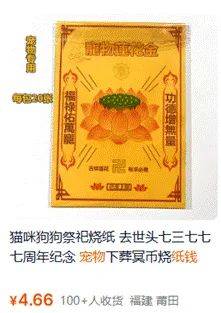 值得注意的是,宠物祭祀不止在清明,不少宠物主会为逝去的宠物“烧七”,即自宠物去世日起每七天祭祀一次,共七次、历时49天。在电商平台上,纸钱、金元宝乃至罐头、猫砂盆、帐篷、空调、别墅等纸扎宠物祭祀用品应有尽有,不少商家还提供代写送钱表文、代烧代祭的服务。