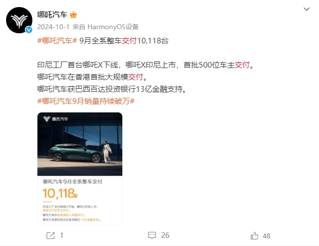 ▲哪吒汽车最近一次公布单月销量(来源:哪吒汽车官方微博)