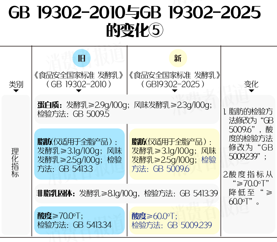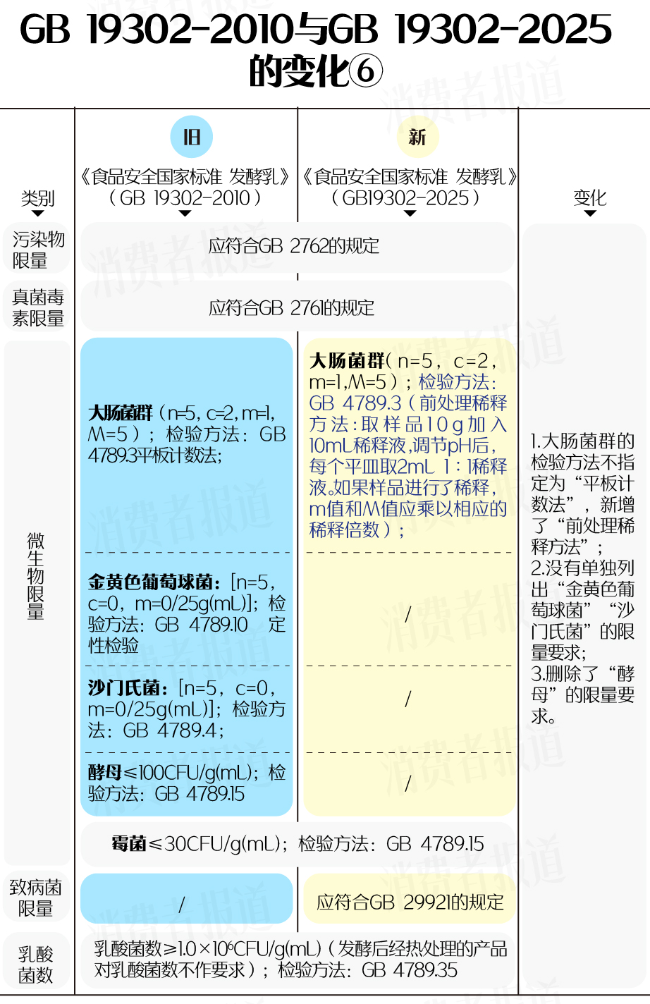降低酸度要求是否会影响活性乳酸菌含量?记者对比乳酸菌数发现,新旧国标中对出厂时乳酸菌数均要求不低于1.0×106CFU/g(mL),说明酸度下调不会影响活菌数。