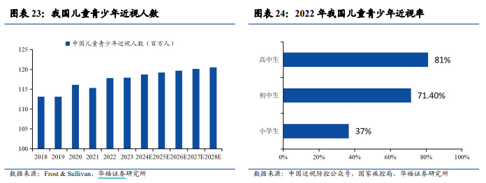 国家卫健委2023年公布的数据显示,全国儿童青少年总体近视率为52.7%,其中小学生为35.6%,初中生为71.1%,高中生为80.5%。另外,根据Frost& Sullivan,2023年我国儿童青少年近视人数约1.18亿人。