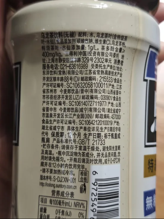 例如,三得利乌龙茶的包装信息显示,该产品在不同地区分别由多个受委托单位生产,包括今麦郎饮品(晋中)有限公司、今麦郎饮品(咸宁)有限公司等。同样,果子熟了品牌的金桂乌龙无糖茶产品的受委托生产商包括紫泉饮料、山东多乐多食品有限公司等。
