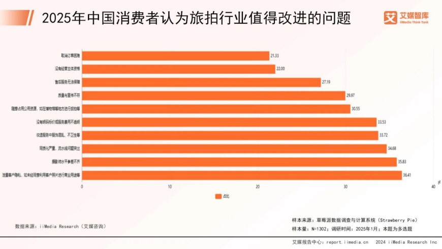 除了拍摄过程的劳累,旅拍也不可避免地陷入同质化、流水线作业的怪圈。艾媒咨询发布的《2025年中国旅拍市场消费行为洞察分析报告》显示,在“旅拍行业值得改进的问题”中,35.83%的人认为摄影师水平参差不齐,34.68%的人认为同质化严重,流水线问题突出。
