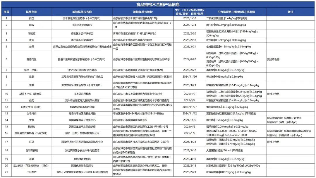 (原标题:质检资讯|山东省市场监督管理局2025年第15期食品监督抽检通告)