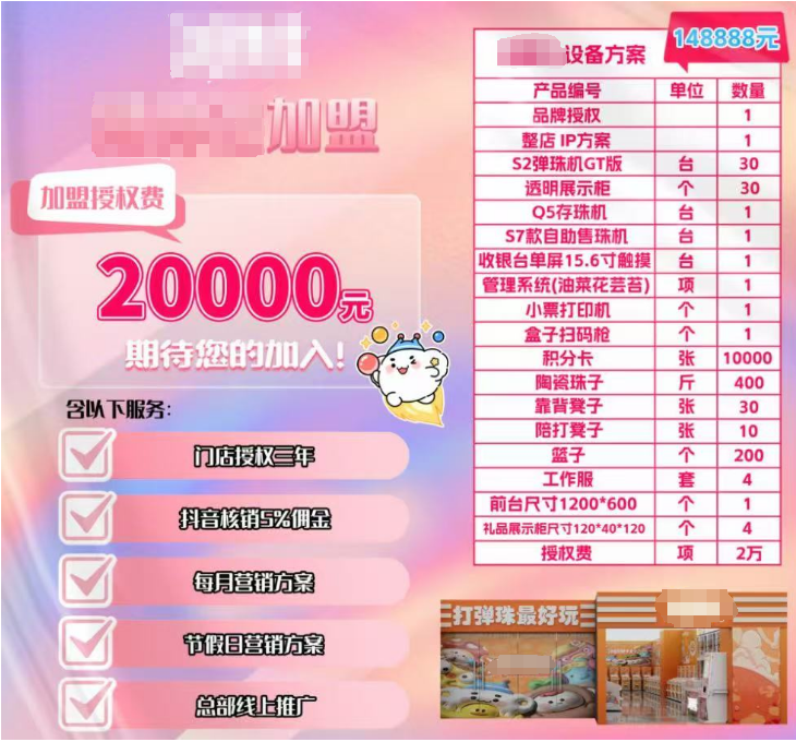 某弹珠机品牌一份价值14.88万元的加盟方案显示,费用包含2万元为期三年的品牌授权费、整店IP方案、推广营销方案,以及弹珠机、自助售珠机、存珠机、积分卡等各式设备。