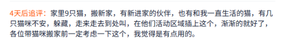 从购买页面的买家评价来看,这类情绪管理产品的好评不少:“好用,喷上我家主子安稳多了。”“安抚剂,用来防止春节鞭炮声的应激也是很OK的。”“差不多10个小时车程和换新环境,猫猫状态都不错。”“家里有一只猫猫不时会嚎叫,用这个叫得少了。”“两个猫宝宝原本打得死去活来的,现在最多是小打小闹了。”……甚至还有一位家有9只猫的猫主也给出了好评。