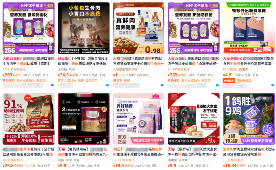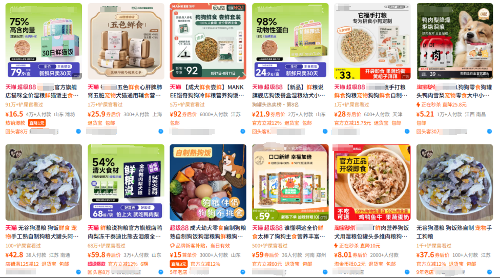 冷藏/冷冻类宠物鲜粮目前则以国产品牌或家庭作坊为主力军。直播间或电商平台上搜索“宠物鲜粮”,推送结果基本为本土品牌或个人/家庭作坊,每袋价格在几元至几十元(约50~80g)。