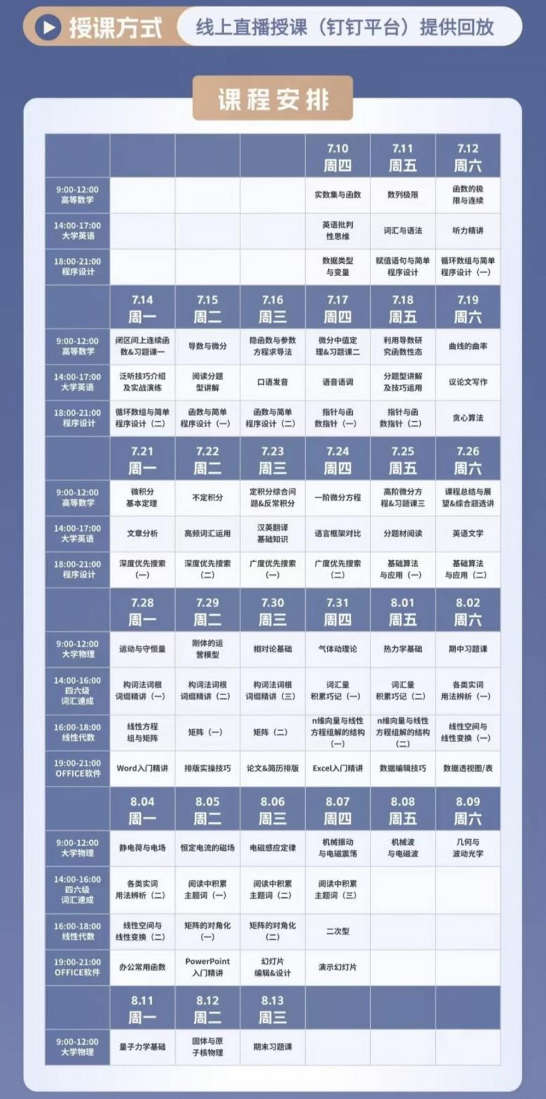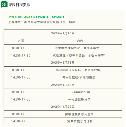 南京邮电大学推出的《高中数学与大学数学衔接课程班》,课程总计32学时,为期4天,授课内容包括大学数学课程导论、代数基础、几何基础、微积分基础等。