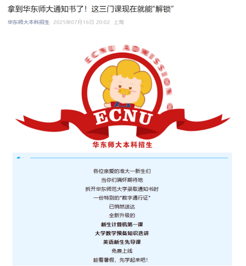 以华东师范大学为例,该校为帮助大一新生完成学习方式跃迁,推出了3门学科线上衔接课堂。其中,《大学数学预备知识选讲》旨在梳理中学数学要点,介绍基本逻辑框架;《新生计算机第一课》重在培养编程思维、AI思维等能力;《英语新生先导课》提供多元学习资源,帮助学生改进英语学习方式和观念。