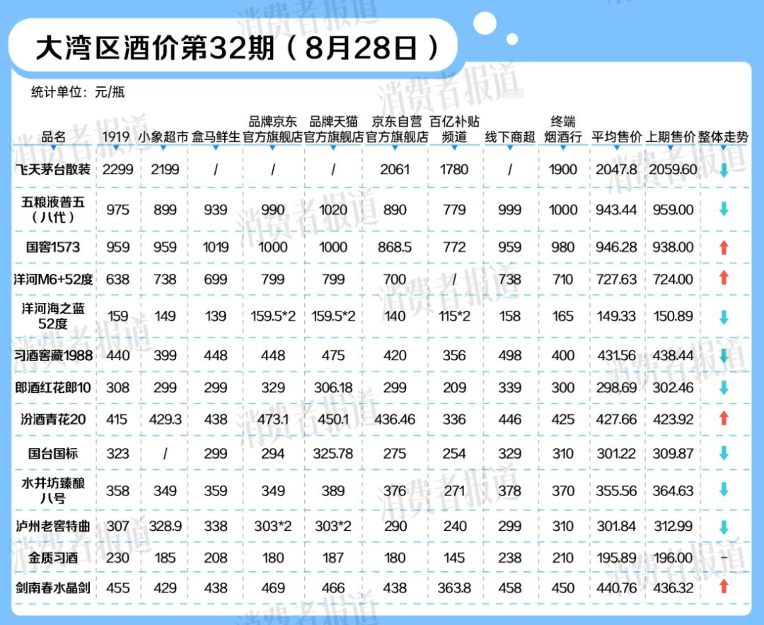 第32期《大湾区酒价》数据显示,与上期(8月19日,下同)相比,本期白酒价格变动幅度明显收窄,仅少数白酒均价变动幅度超过10元/瓶以上。但两款高端白酒——飞天茅台、五粮液八代——的价格下跌相对较大。