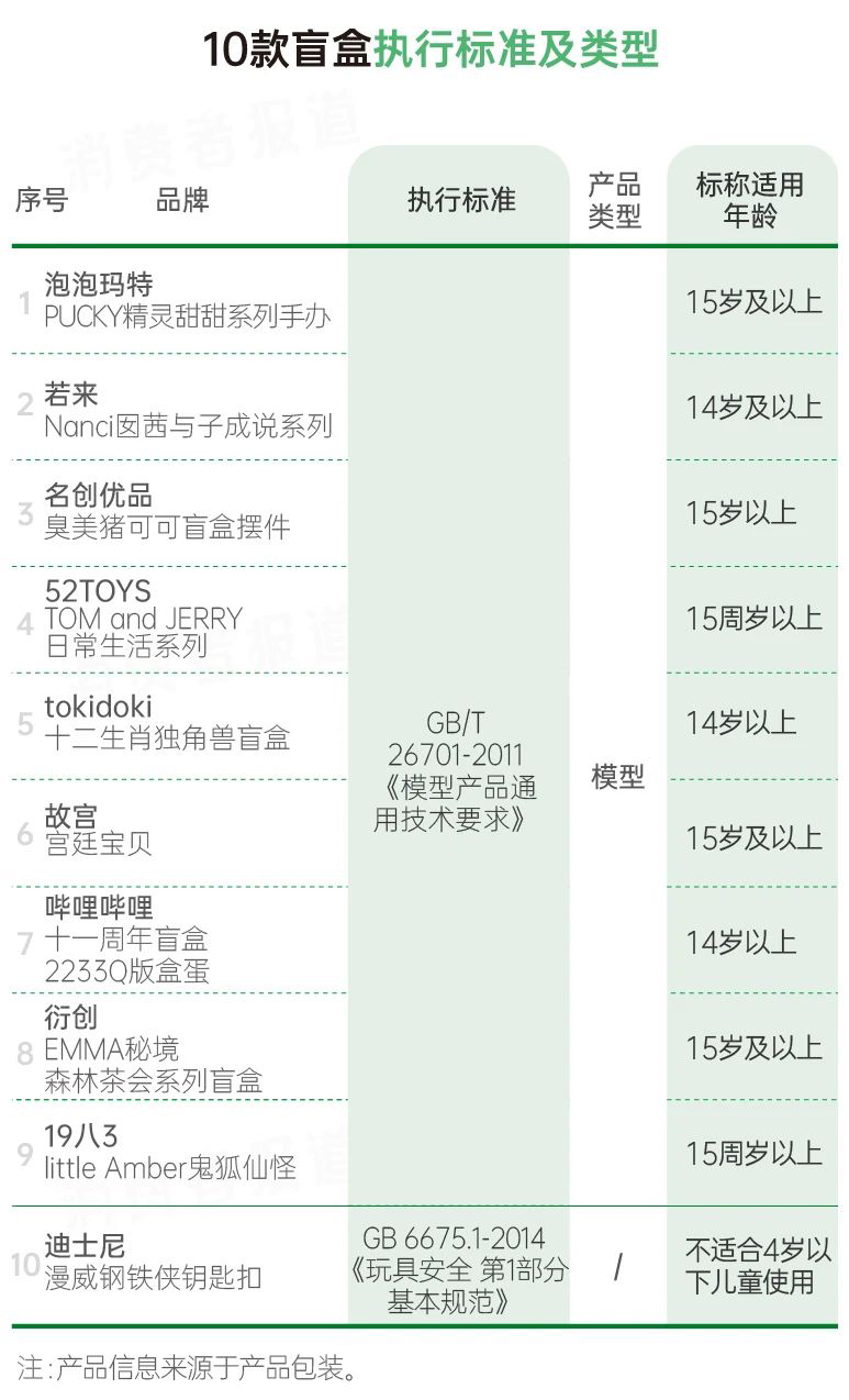 《消费者报道》记者在2021年曾购买10款市面上热销的盲盒,发现在包装上,泡泡玛特、哔哩哔哩、名创优品等9款盲盒均标注执行的是模型标准GB/T 26701—2011《模型产品通用技术要求》,只有1款迪士尼盲盒标注执行了玩具的标准GB 6675—2014《玩具安全》。