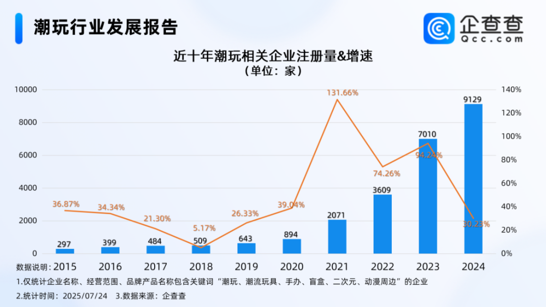 根据企查查数据,国内现存潮玩相关企业2.36万家。近十年相关企业注册量呈快速增长态势,2024年全年注册9129家相关企业,同比增长30.23%。截至2025年7月,今年已注册潮玩相关企业6330家,其中前6个月注册5491家,同比增长41.08%。