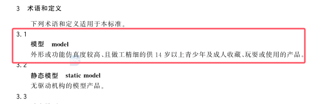 GB/T 26701—2011《模型产品通用技术要求》则规定了模型产品的术语和定义、技术要求、试验方法等。该标准指出,模型是外形或功能仿真度较高、且做工精细的供14岁以上青少年及成人收藏、玩耍或使用的产品。
