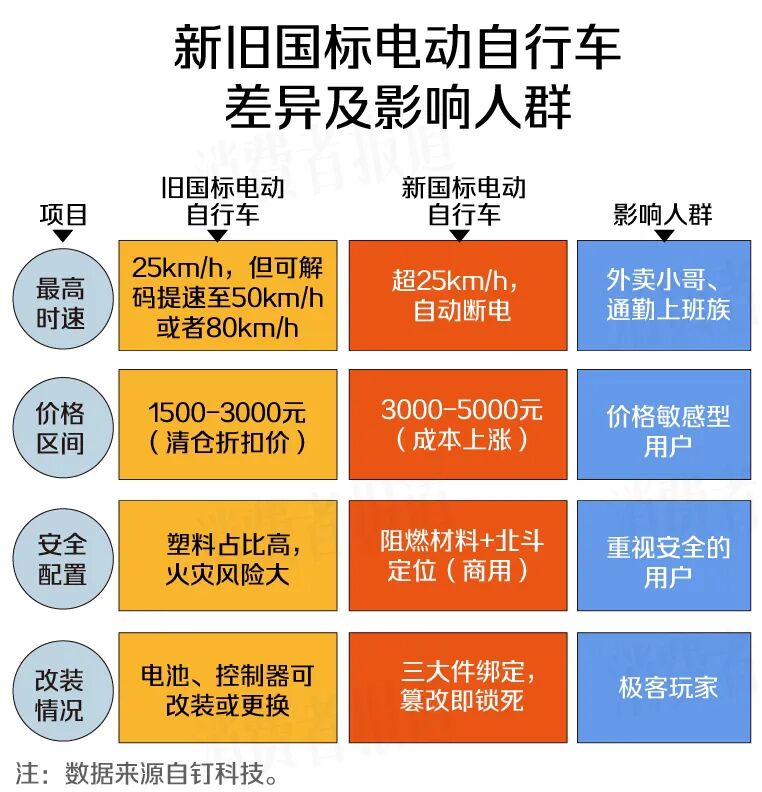 根据钉科技的报道,对于预算有限但对速度有硬性要求的人群,例如外卖骑手或需要长途通勤者,清仓折扣价(1500—3000元)的旧国标车仍具吸引力,它们通常可解码提速至50km/h左右。然而,新国标车(主流3000—5000元)严格执行超25km/h自动断电的限制,价格也因安全成本上升而更高,更适合预算充足、将合规和安全置于首位的普通用户。