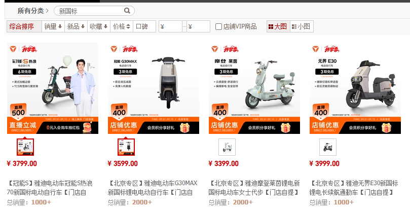 《消费者报道》记者查询新国标雅迪电动自行车在电商平台上某官方旗舰店的售价,发现目前销量在1000辆以上的4款电动自行车的售价均在3000元以上。而同店铺的旧国标电动自行车价格可下探到2000元。