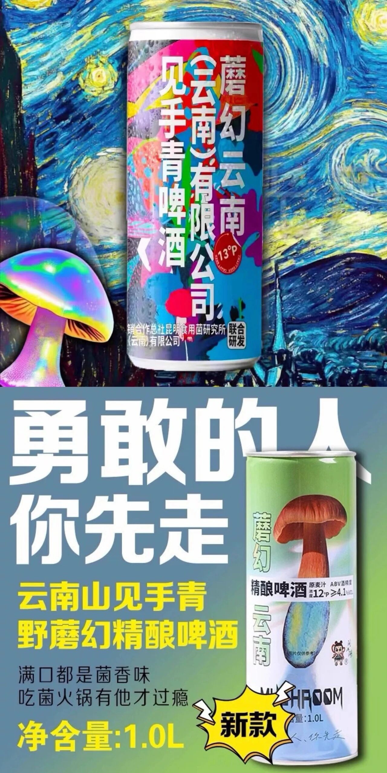 如今,它竟现身于精酿啤酒里。一句“勇敢的人你先走”的广告语,让人闻到“危险”的气息:喝啤酒也能变成“生死局”?但恰恰是这种玩法,精准拿捏了当下年轻人追求刺激的猎奇心理:浅尝一口,说不定真能看到“跳舞的小人”呢?目前,某款见手青口味精酿啤酒在电商平台上已有上千销量。