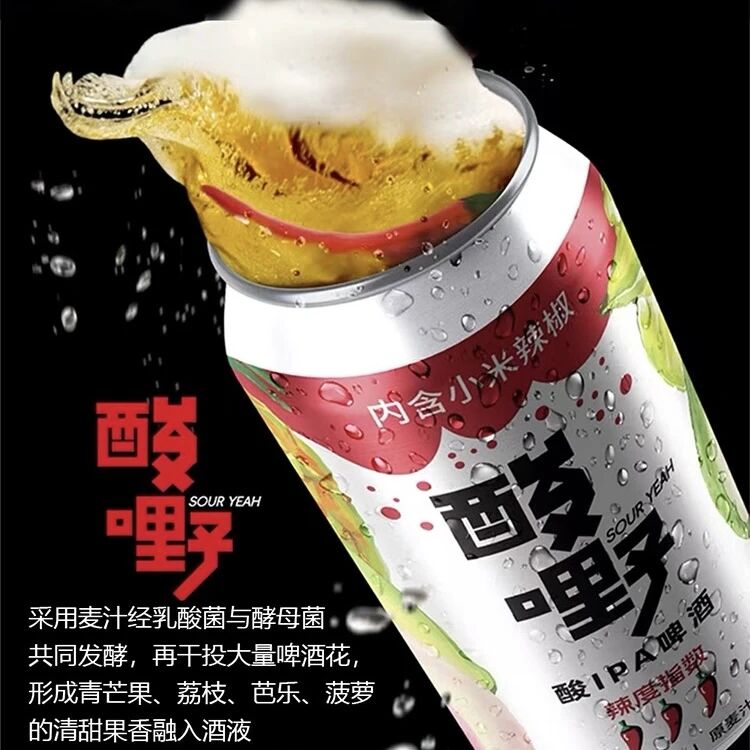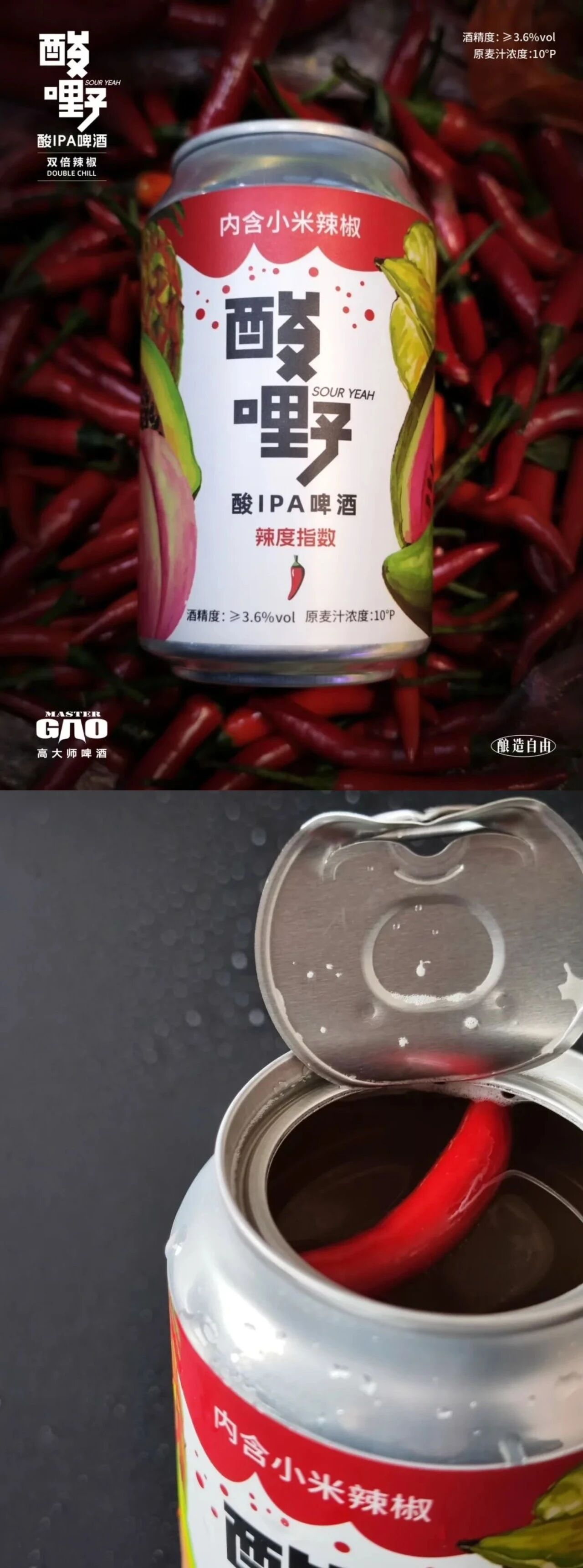 今年3月,精酿品牌高大师做了一次大胆的地域风味尝试,将广西老表喜食的“酸嘢”移进了啤酒罐。酸嘢为广西传统名小吃,以青芒果、菠萝、木瓜、芭乐、萝卜、黄瓜等时令果蔬为主料,辅以酸醋、辣椒、白糖等腌制而成,兼有酸、甜、咸、香等多种风味。高大师“酸嘢IPA”啤酒不仅呈现出青芒果、荔枝、芭乐、菠萝等水果香气,更有趣的是,拉开拉环,你会看到一只完整的小米辣漂浮在啤酒上,视觉效果拉满。