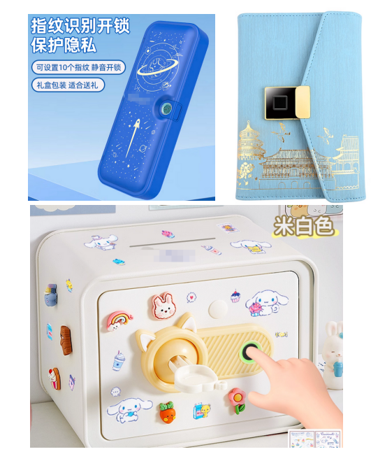指纹文具盒(上左)、指纹笔记本(上右)、指纹存钱罐(下)图源:电商平台