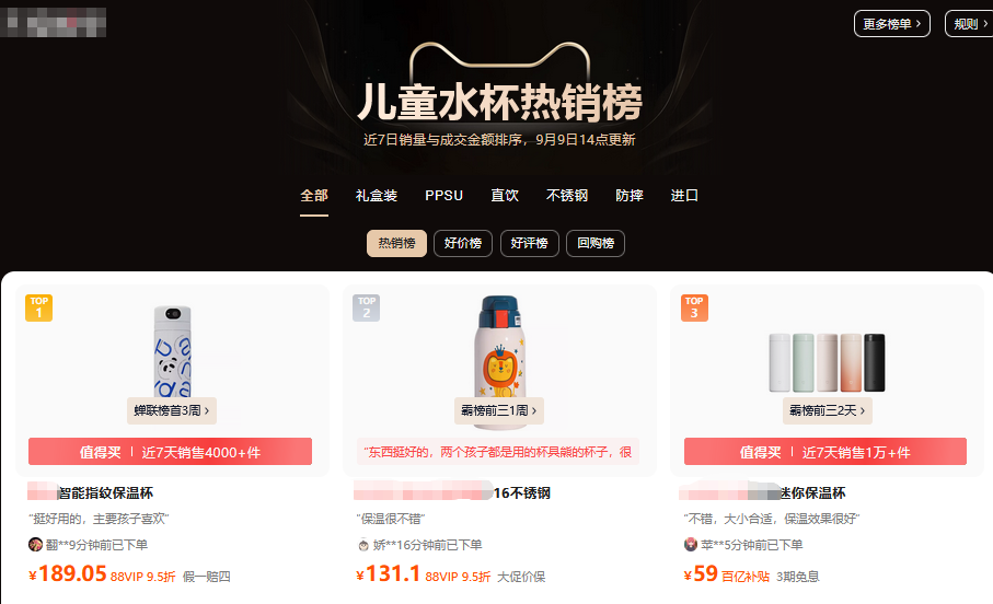 某电商平台儿童水杯热销榜