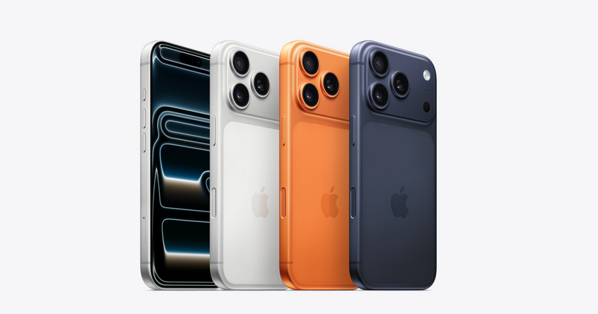 iPhone17 Pro为6.3英寸,iPhone17 ProMax为6.9英寸,3个配色依次为银色、星宇橙色、深蓝色 图源:Apple官网