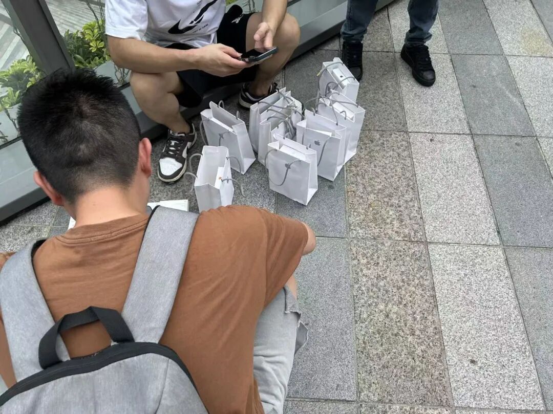 广州天环广场苹果零售店外,部分“黄牛”与拿到新机的用户进行交易《消费者报道》记者摄