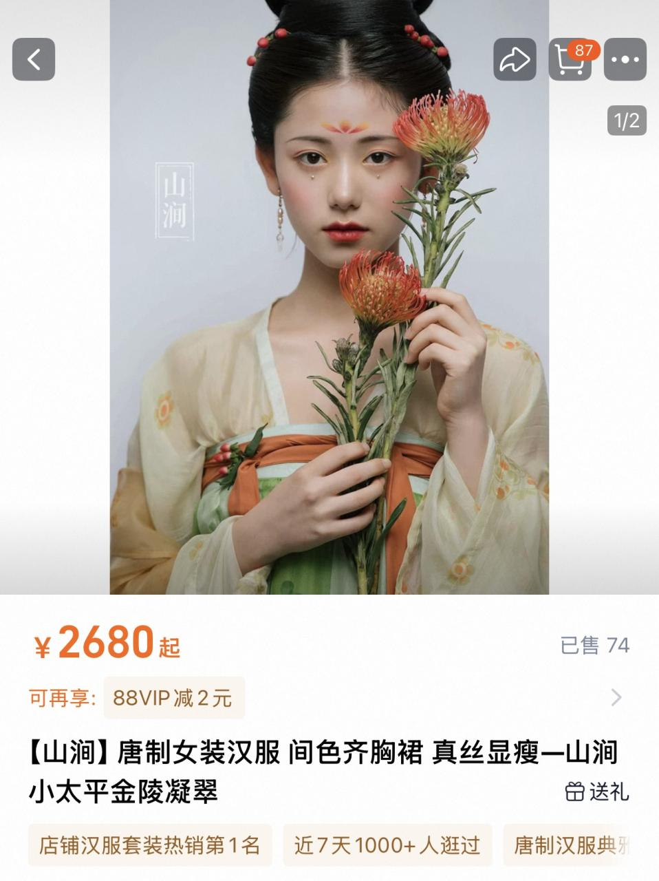 值得一提的是,《盛世天下》的精致感藏在细节里,就连群演的服饰也未敷衍了事。有细心网友发现,剧集开篇秀女们穿的服装,来自汉服品牌“山涧”。《消费者报道》记者在电商平台检索可见,该套服装的单套售价达2680元。这种对细节的考究,成为它迅速俘获受众的重要原因之一。