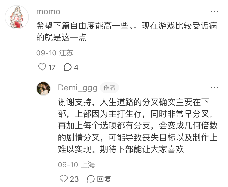 面对这类声音,制作人Demi在社交平台上做出回应。她坦言,人生道路的分叉确实主要在下部,上部主打生存。如果非常早分叉的话,再加上每个选项都有分支,会变成几何倍数的剧情分叉,可能导致丧失目标以及制作上难以实现。她表示,“期待下部能让大家喜欢。”