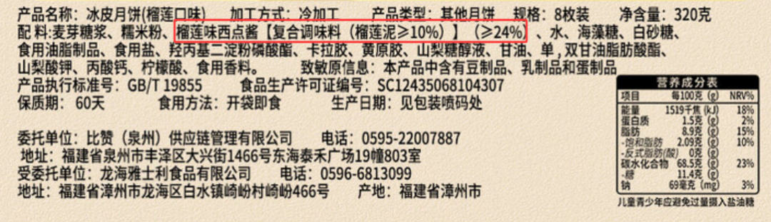 例如,在比比赞榴莲口味冰皮月饼的配料表中,排在第三位的是“榴莲味西点酱【复合调味料(榴莲泥≥10%)】(≥24%)”。经计算得知,该品牌一块40克的月饼中,榴莲泥的含量竟不足1克(40×24%×10%=0.96克)。