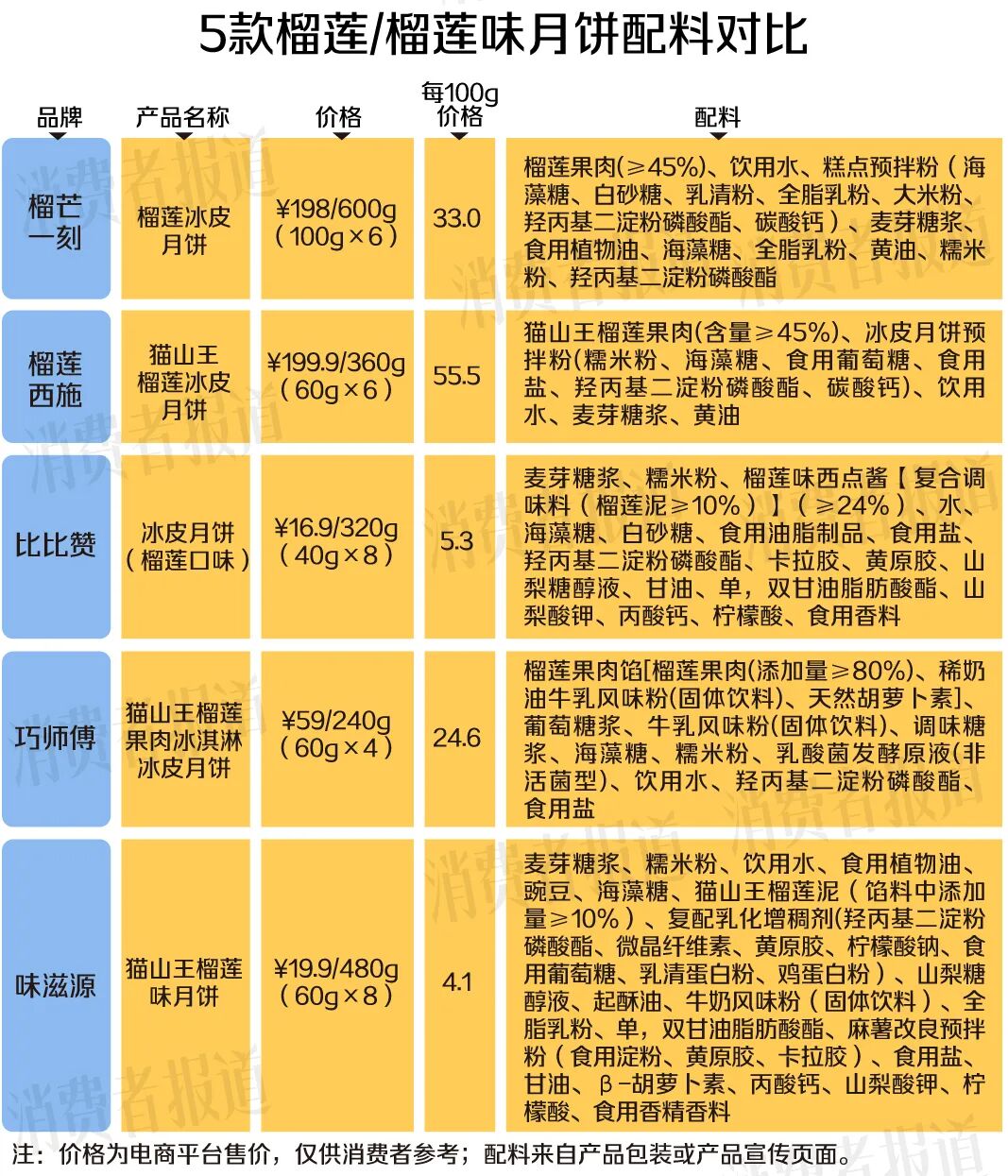 不同品牌的“榴莲月饼”,每100克价差超10倍