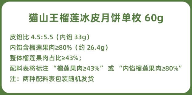 而在巧师傅相关产品的配料中,“榴莲果肉馅”排在第一位。根据电商宣传页面介绍,巧师傅猫山王榴莲果肉冰淇淋冰皮月饼的皮馅比为4.5:5.5,一块60克的月饼的榴莲果肉含量为26.4克。