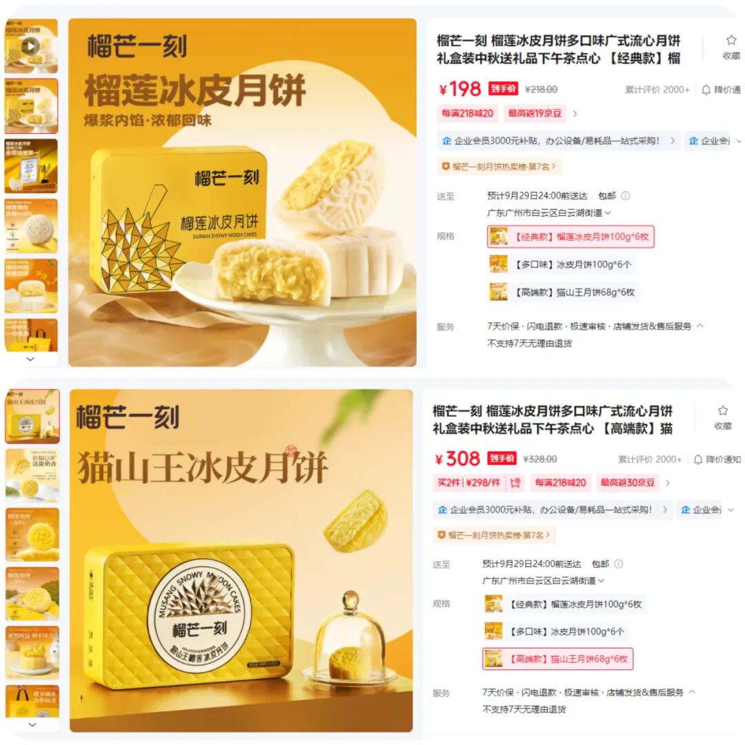 所用榴莲品种的差异,直接体现在月饼的价格上。以榴芒一刻为例,在同一电商平台上,其榴莲冰皮月饼使用的是金枕榴莲果肉(≥50%),价格为198元/600克;猫山王榴莲冰皮月饼使用的是猫山王榴莲果肉(≥50%),价格为308元/408克。2款产品的榴莲含量仅相差了5%,但以每100克价格来看,“猫山王”(74.3元)比“金枕”(33.0元)贵了41.3元。