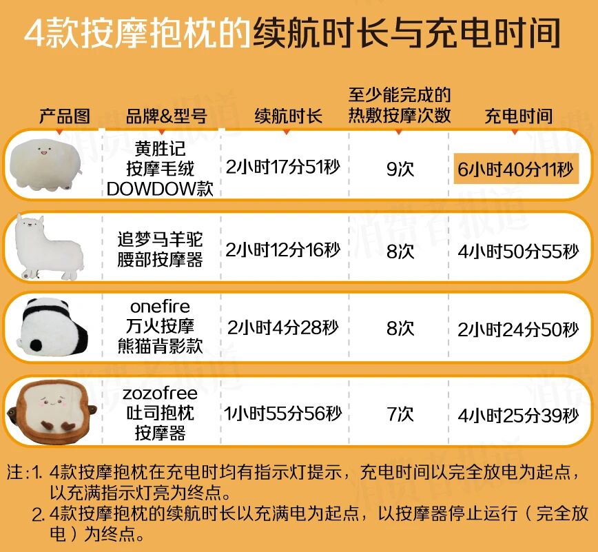 4款按摩抱枕运行一次热敷按摩程序的时长约15分钟。消道长对它们的续航及充电时长分别进行了测试,续航时长以充满电开始,到完全放电、停止运行为止;充电时长从完全放电开始,到充满指示灯亮为止。
