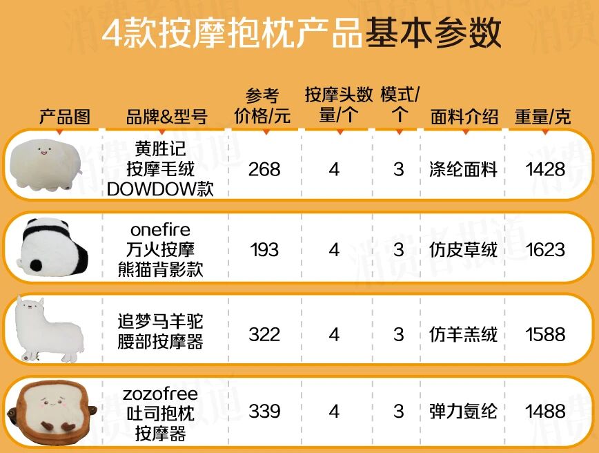 为了让大家对上述四款按摩抱枕有更直观的了解,消道长综合试用对比数据和志愿者的反馈,整理了4款按摩抱枕的综合评价。