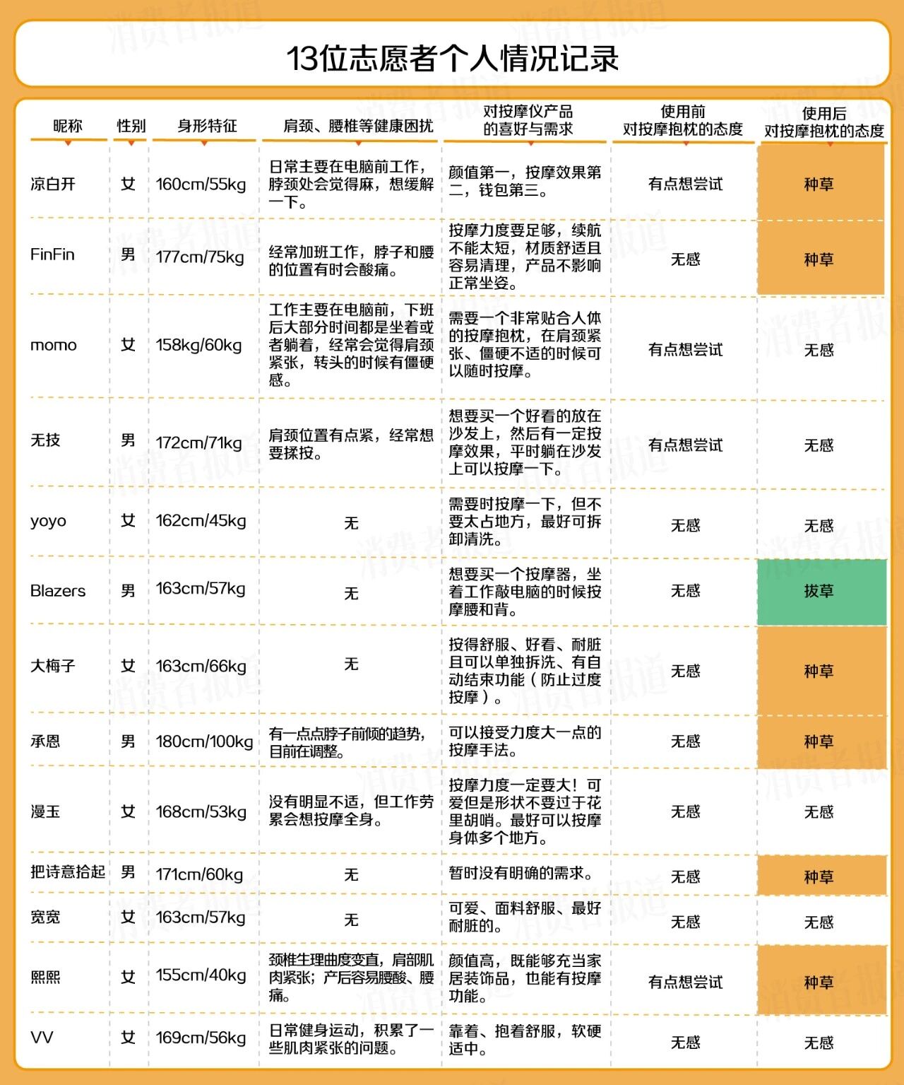 而从13位志愿者的试用体验和评分看,这些按摩抱枕并非徒有其表:近半数人被4款按摩抱枕“种草”,只有一位明确表示“拔草”。