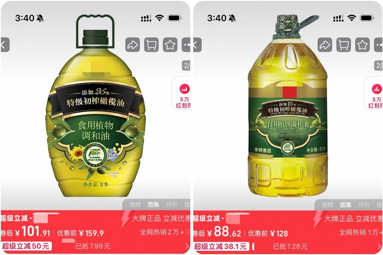 不过,高价值油种的添加比例会直观地反映在产品的终端售价上。以同一品牌两款5升装调和油为例,橄榄油添加量为10%的产品,售价约88元;添加量为25%的产品,售价则增至约101元。两者配方相近,主要差异在于橄榄油占比,但价格相差了约13元。