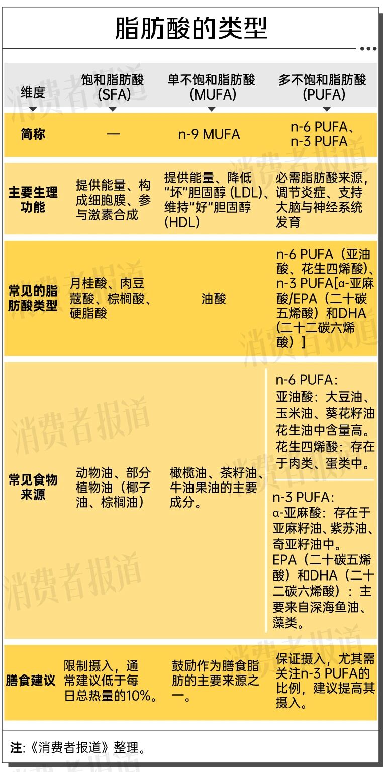 饱和脂肪酸(SFA)主要来自猪油、羊油、牛油、奶油等动物性脂肪,以及椰子油、棕榈油等部分植物油。单不饱和脂肪酸(MUFA)主要指n-9系列脂肪酸,这种脂肪酸是目前公认的“健康脂肪”。多不饱和脂肪酸(PUFA)中含有两种人体自身无法合成、必须从食物中摄取的脂肪酸:亚油酸(属于n-6多不饱和脂肪酸)和α-亚麻酸(属于n-3多不饱和脂肪酸)。