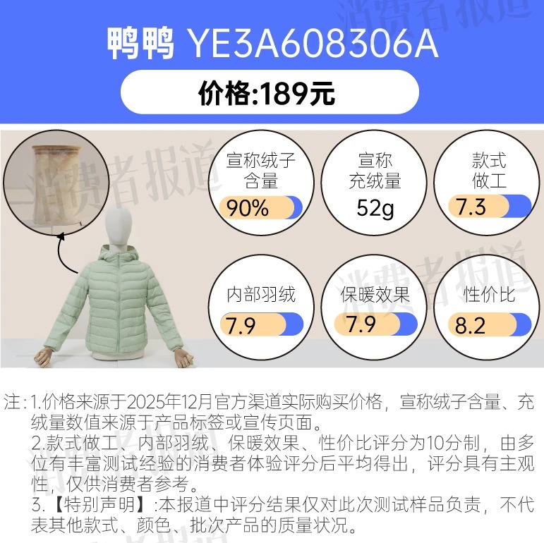 在性价比方面,鸭鸭 YE3A608306A羽绒服脱颖而出,其售价189元,是9款羽绒服中最平价的,但在内部羽绒、保暖效果的评分上却毫不逊色。