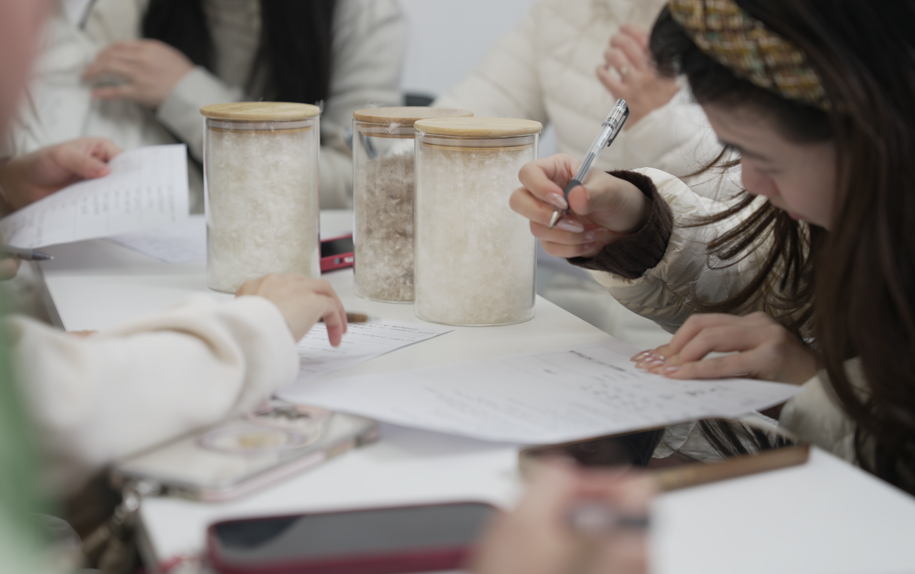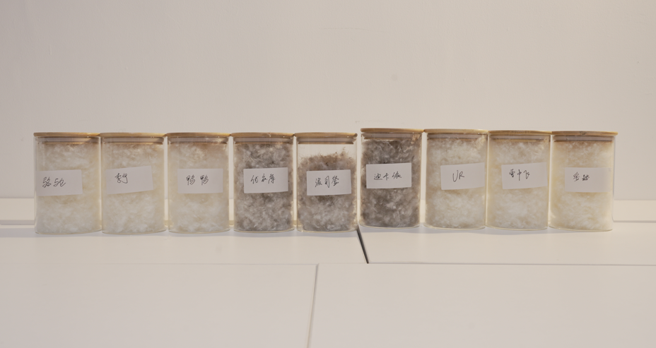 在进行现场衣服试穿、羽绒材质观察环节之前,我们对9款羽绒服稍做剪破处理,进行羽绒材质取样,并将每款内部羽绒分别存放于9个透明玻璃罐中。