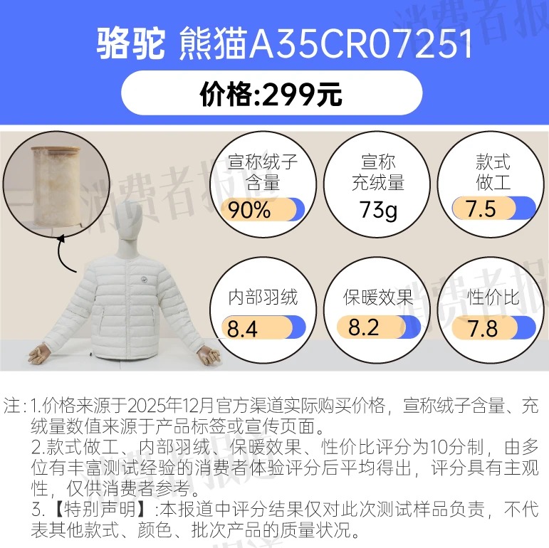 究竟该如何选购一件称心如意的羽绒服呢?近日,《消费者报道》采购了9款市面上较热销的入门级羽绒服进行对比,售价在180元~350元之间,品牌及货号分别为波司登 B250130004B、骆驼 熊猫A35CR07251、优衣库 478572、鸭鸭 YE3A608306A、雪中飞 X250137022F、安踏 962545901、UR UYY150048、迪卡侬 Trek100、李宁 AYMU230-1。